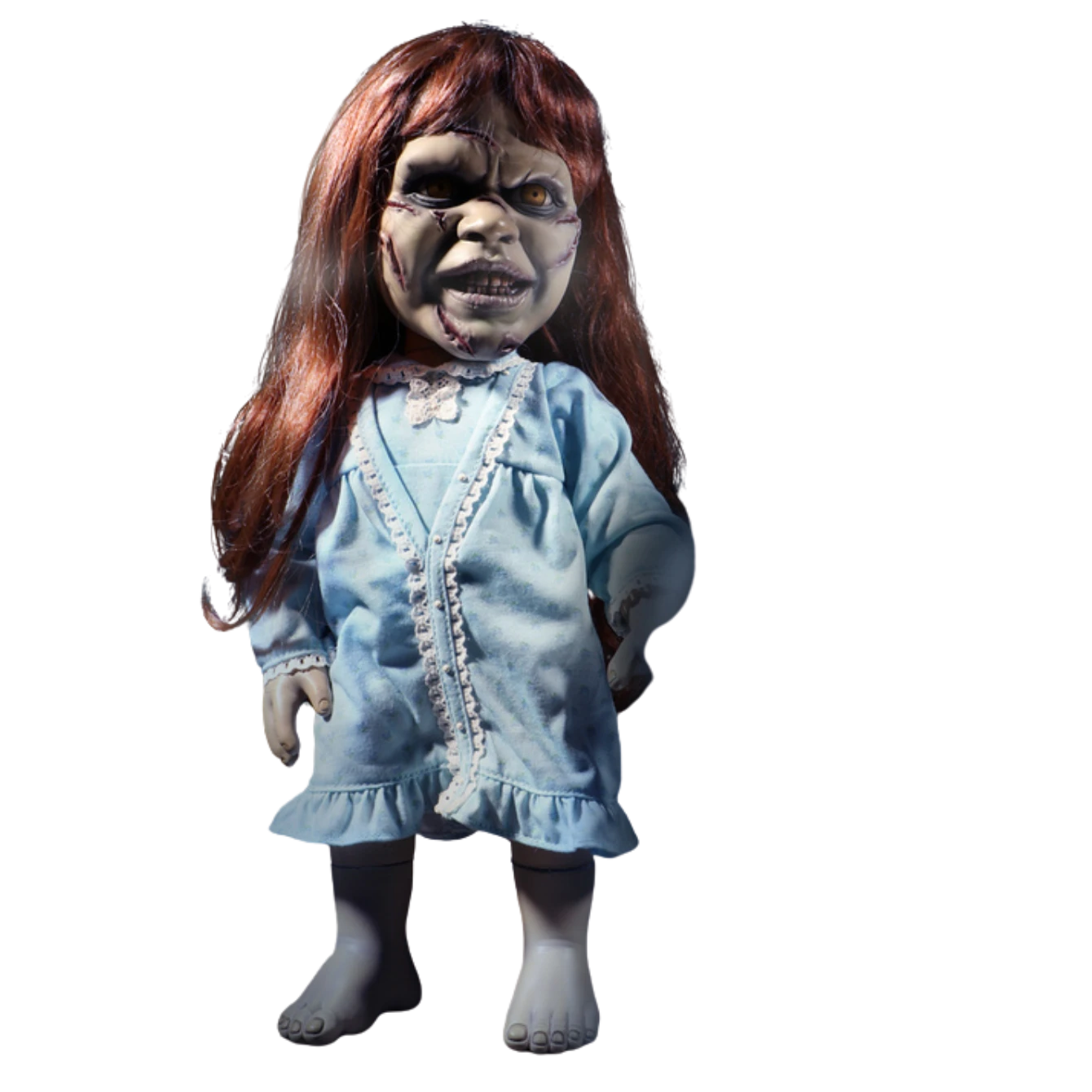 Standing at a menacing 15 inches tall, Regan MacNeil from The Exorcist is presented in a real cloth nightgown from the film. The possessed youth says 6 iconic and hair-raising phrases including “It burns!” and “Keep away! The sow is mine!”. The devil is in the details and each of them have been captured here; from Regan’s untamed real hair to her crazed, piercing eyes and maniacal grin. This Mega Scale Exorcist figure features 11 points of articulation for dynamic nightmarish poses.