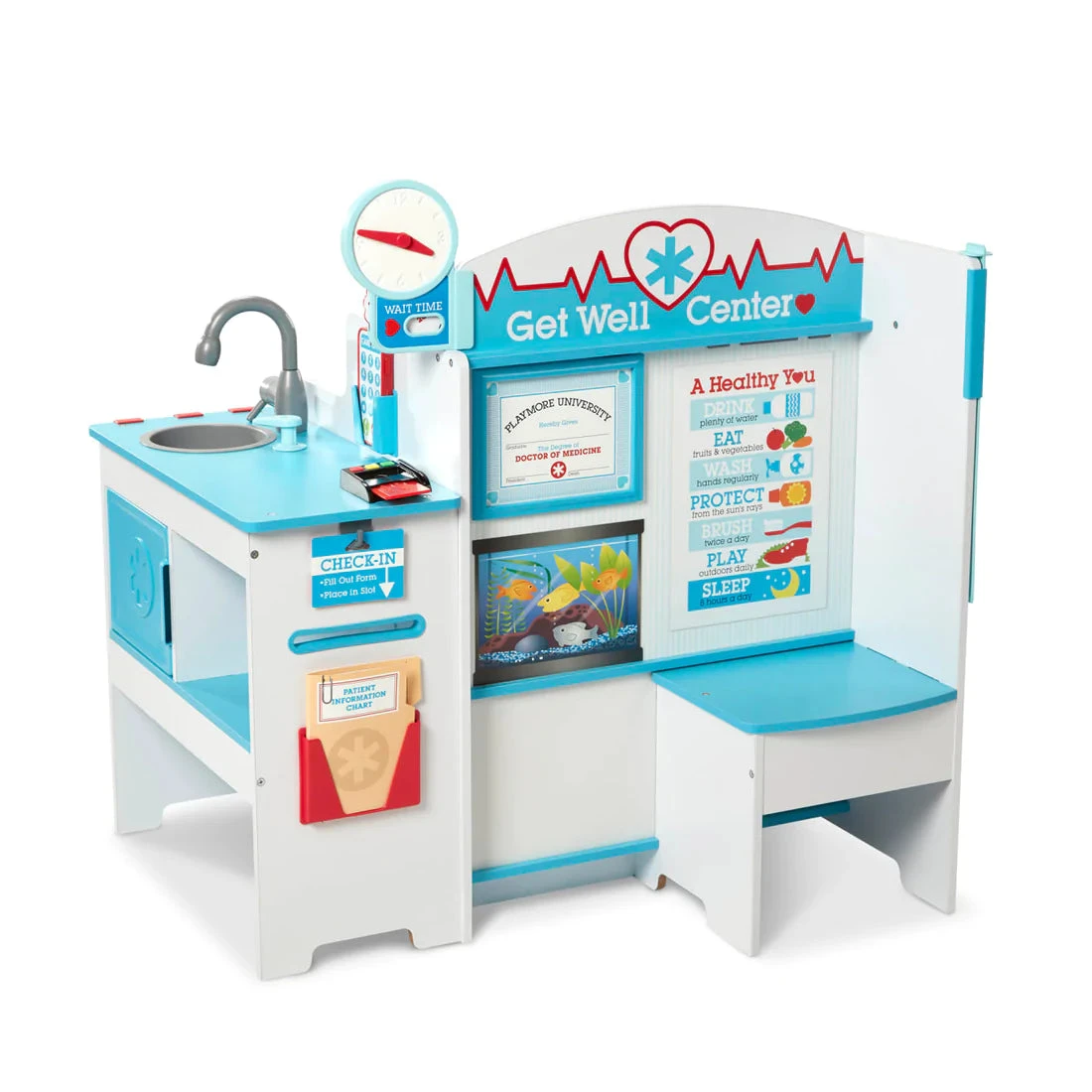 This sturdy, multi-sided wooden play space has everything kids need to role play visits to the doctor’s office! Kids can be the patient or the doctor, the receptionist, or the nurse. It’s a great way to ease kids’ fears about doctor visits and to encourage nurturing and empathetic play. The waiting area includes a seat, clock, and fun changeable artwork. Sign in and check out with a credit card reader and card, fill out a reusable patient file, and take appointments with the wooden play phone. Wash up in the sink, display X-rays, monitor blood pressure, tip the scale, measure height, and read the eye chart. There’s plenty of storage in this easy to assemble play space (illustrated instructions included; Phillips head screwdriver required). Standing 35.5″ x 37.25″ x 21.25″, there’s also plenty of room for imaginations to grow!