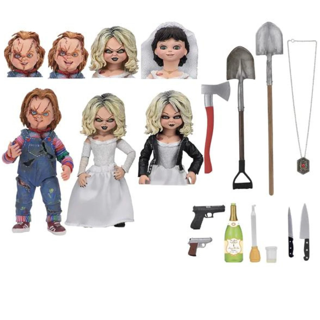 This Ultimate action figure 2-pack includes Chucky and Tiffany, who features a fabric skirt and an extra set of removable arms so she can wear her iconic leather jacket. The set also includes tons of accessories to recreate the movie’s best scenes: 6 interchangeable heads, 2 shovels, 2 pistols, 2 knives, bottle, baster, necklace and more! The figures stand 4″ tall and have over 20 points of articulation.