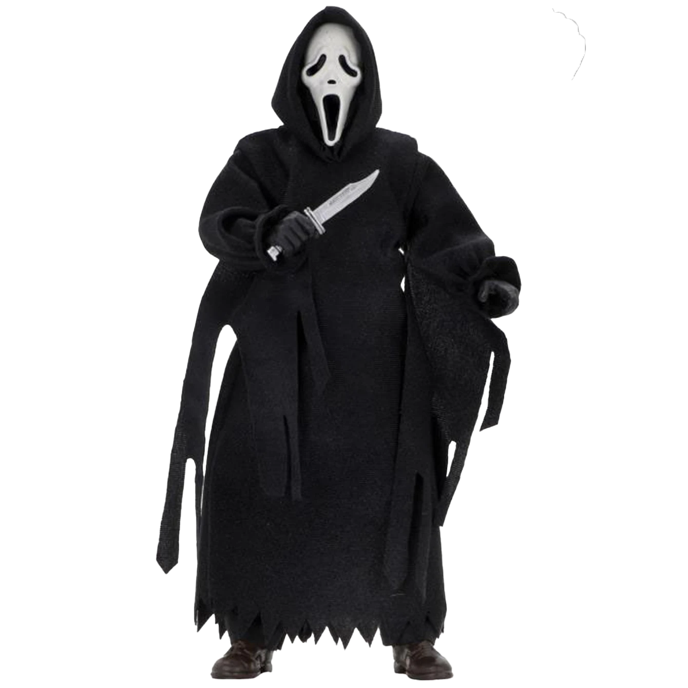 Ghostface stands 8β³ tall and is fully poseable, with a tailored robe, hood and sleeves modeled after the real life Ghostface costume. He features a screen-accurate sculpted mask, interchangeable hands, and comes complete with his signature knife.