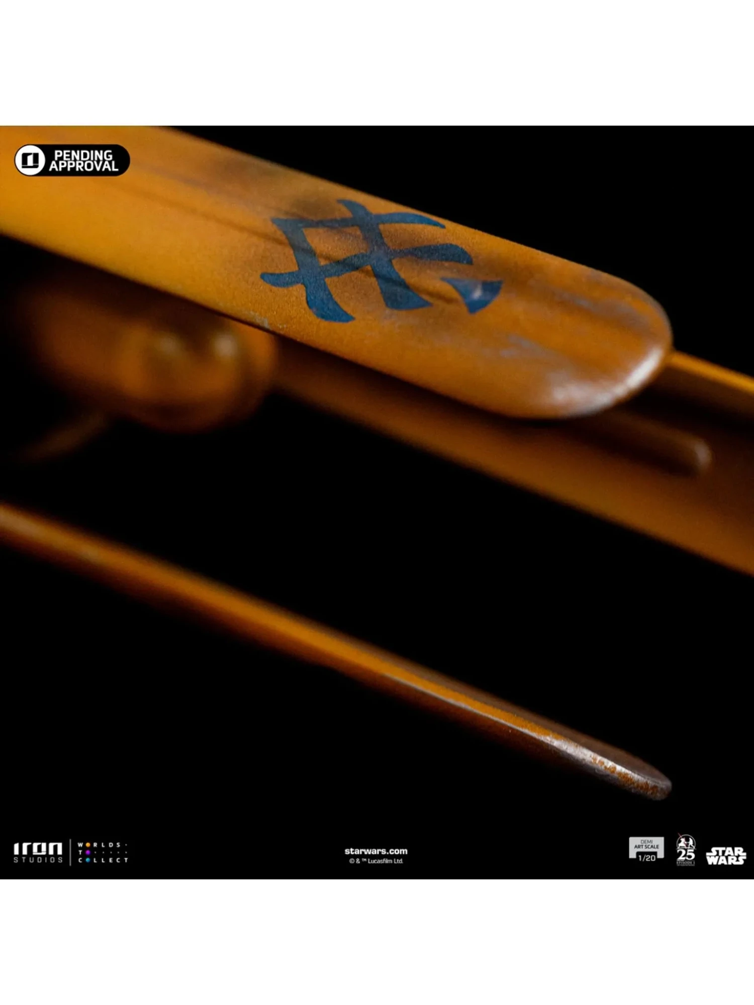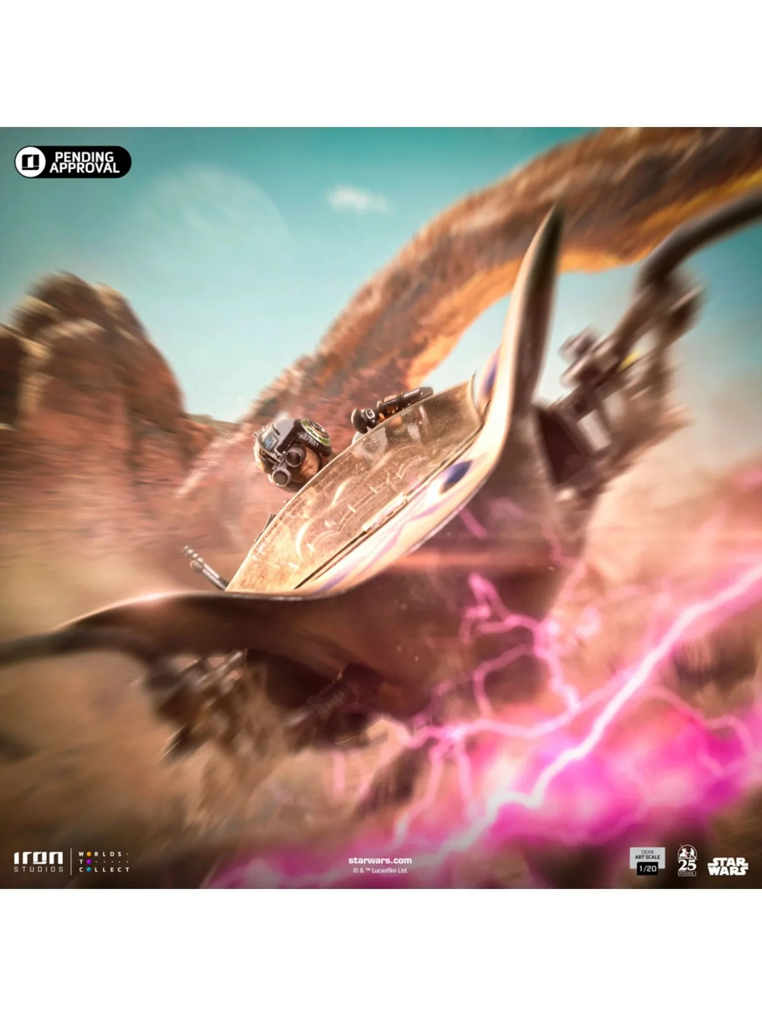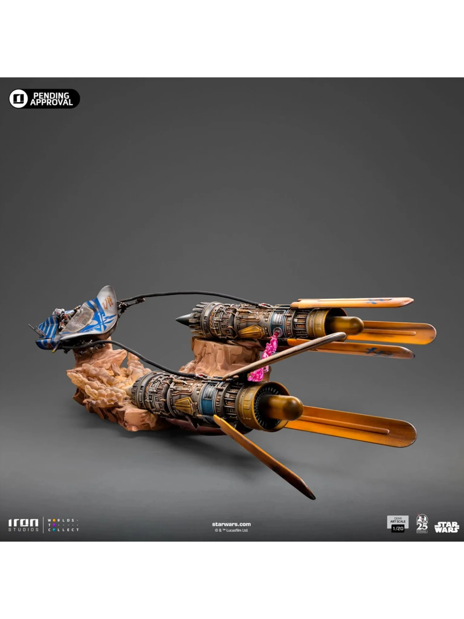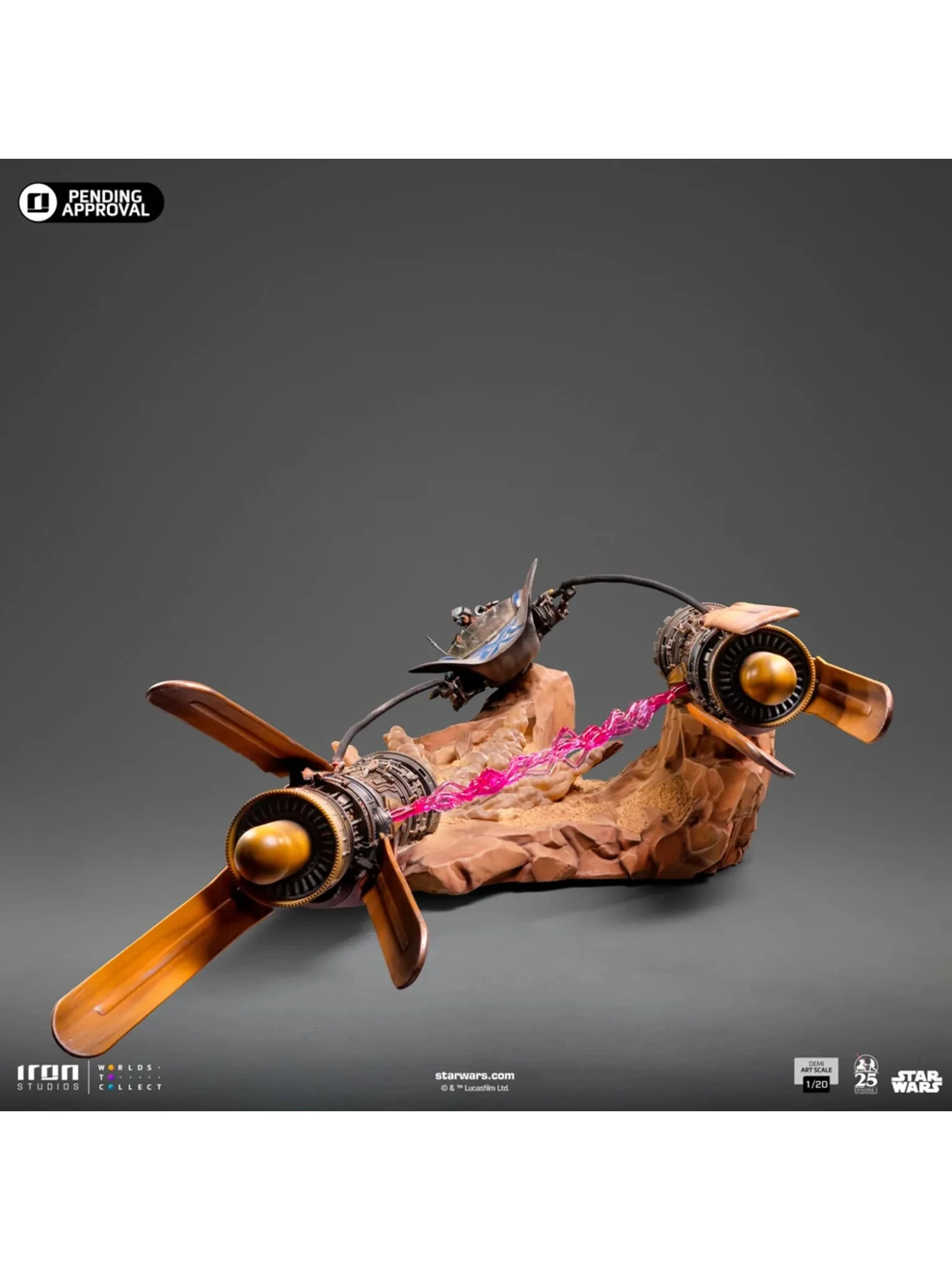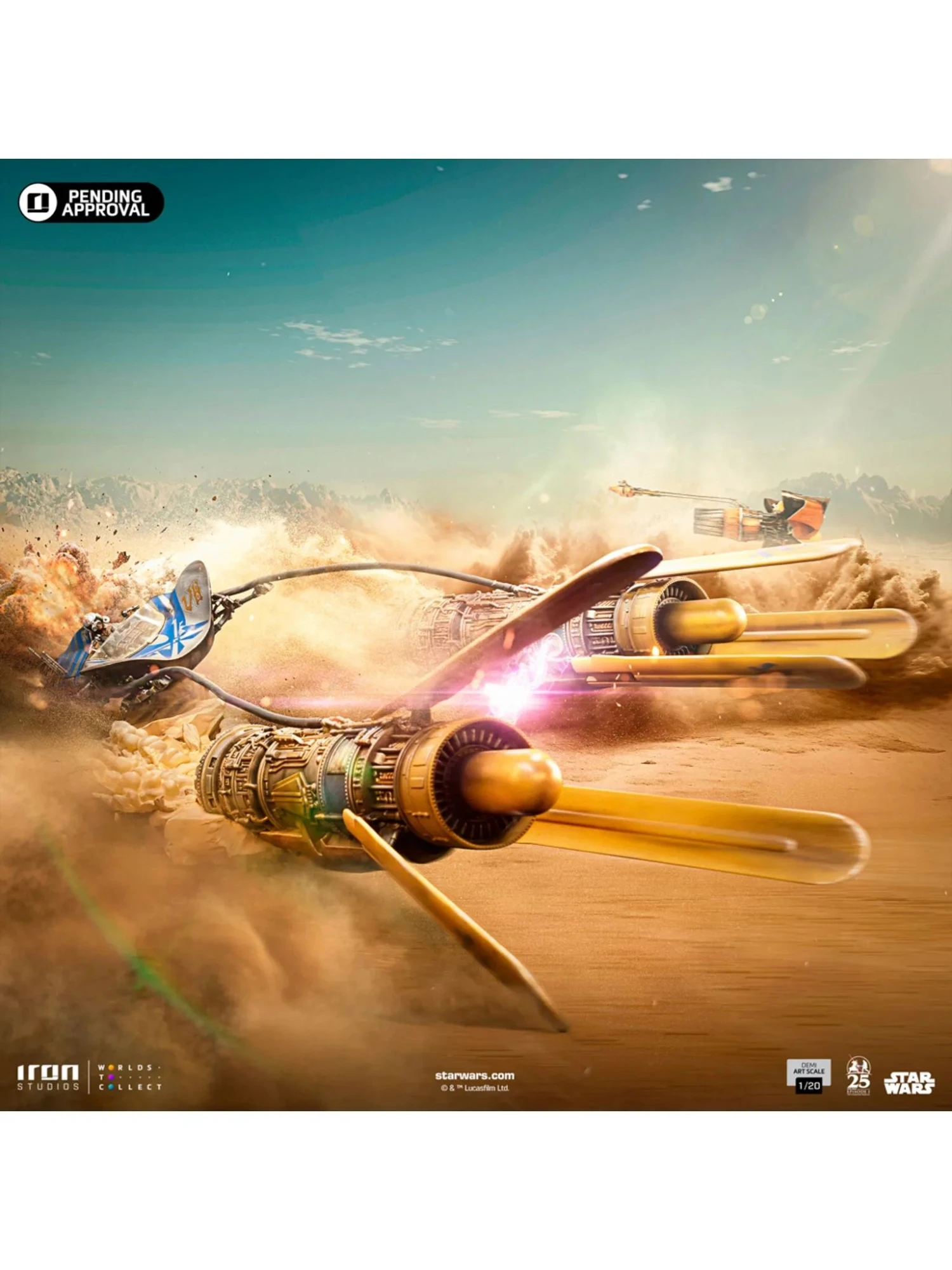 Over the scorching sands from the desolate and desertic planet Tatooine, among gorges, mountains, caves, and treacherous rocky formations, a dangerous and mortal race competition takes place. Moving in high speed with perilous maneuvers, one-man repulsorcrafts known simply as Podracers compete among themselves, like sleds propelled by big turbine engines. Believing to be the only human being capable of competing, in a scenario in which this sport is usually practiced by aliens from various worlds, an enslaved boy from the Mos Espa market, joins a Jedi master in a bet in which the prize is his freedom. Over a diorama base replicating part of the race’s track, with one of the propeller turbines raising clouds of sand next to the ground, displaying a dynamic scene with the vehicle inclined as if it’s turning a curve, Iron Studios present the statue “Anakin’s Podracer – Star Wars – Demi Art Scale 1/20”, with the young Skywalker in his vehicle built by his own hands, in the emblematic scene where he fights for his freedom in Star Wars Episode I: The Phantom Menace (1999) which celebrates its 25th Anniversary, commemorated by Iron Studios with this release!