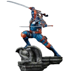 The Deathstroke Premium Format™ Figure measures 24” tall x 16” wide x 21” deep as the villain stands triumphant over his foes, the Teen Titans. Wielding dual swords, Slade Wilson strikes an action stance, ready to hunt down his next targets with every lethal weapon in his arsenal. The stone-like rooftop base features a sculpted gargoyle bust and includes hidden reliefs of several defeated heroes within the architecture. Fans can uncover Teen Titans team members like