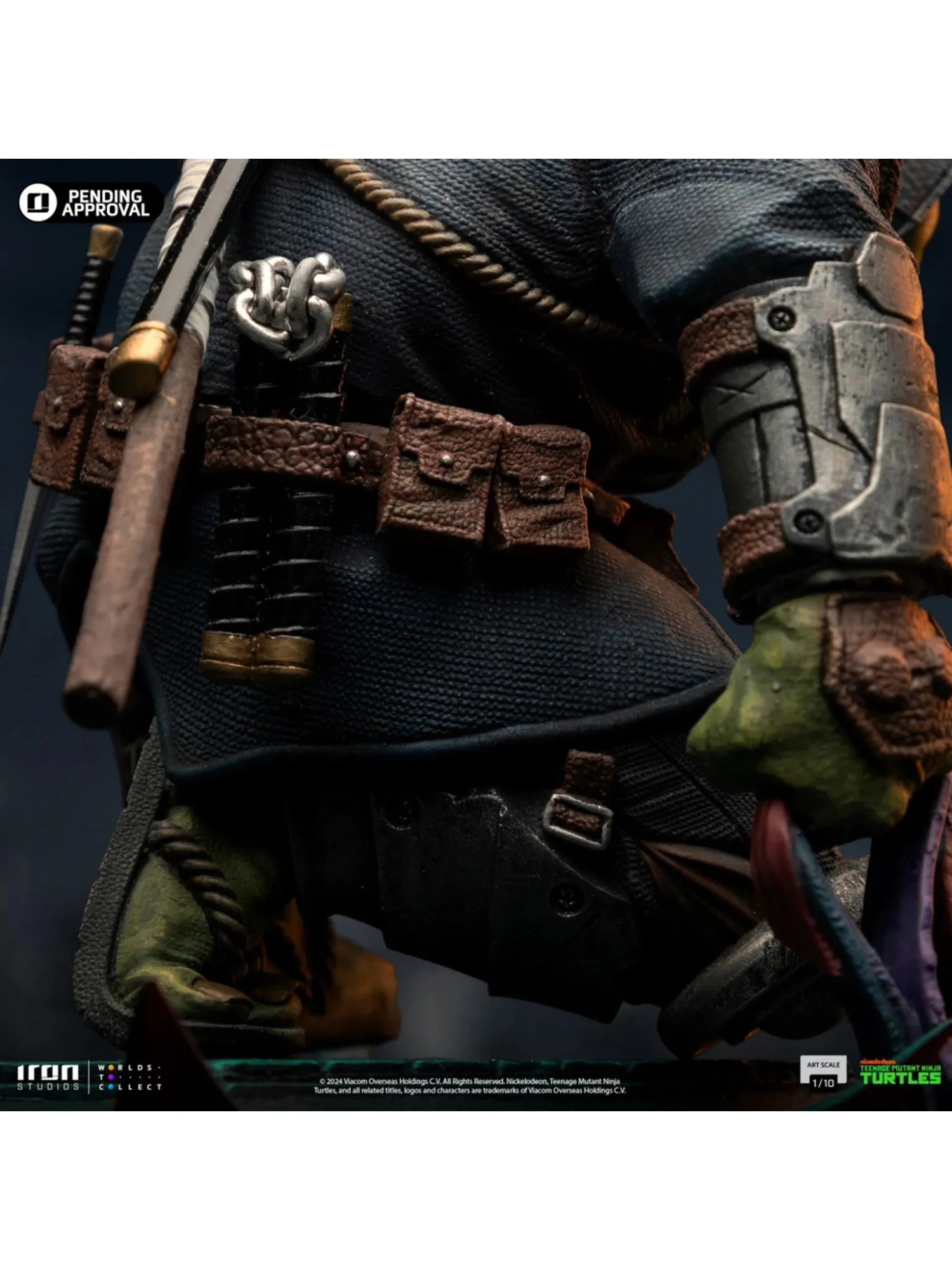 Above the characteristic roof of an oriental pagoda, crouching on top of the long and curved tiles, a striking feature of this traditional Japanese architecture, the veteran ninja warrior, survivor of many battles stays still while observing. Carrying on his back a Bō staff and a Ninjatō sword tied to his shell, and a Sai dagger alongside a Nunchaku strapped to a tactical belt with pockets on his waist. He holds tight another Nunchaku in his left hand and the characteristic colorful bandanas in his right hand, that, just like the weapons he carries, are marks from his brothers. Wearing a black ninja costume, composed by fabric and metal forming his armor, the head covered by a hood and the face with a black mask over his eyes, and infrared glasses handing from his neck, Iron Studios presents the statue “The Last Ronin – TMNT – Art Scale 1/10”, inspired by the story of the last of the chelonian mutant ninja heroes.